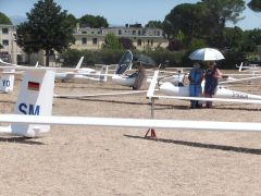 15 pm. Today's tail wind, 6 to 9 knots, forced us to grid the glider's real, real tight so as to maximize the TORA (Take Off Run Avaiable) 12 am. Today we have wind from South/West. Only in South East of the task’s area there will be good thermal activity with cumulus above 4.000 m. Good SW winds North of the task’s area; weak winds from SW with Adriatic sea breezes in the SE area. Probably wave of SW wind. Thermal activity will probabily decrease at 5 pm LT in the center area, at 6 pm LT over t...